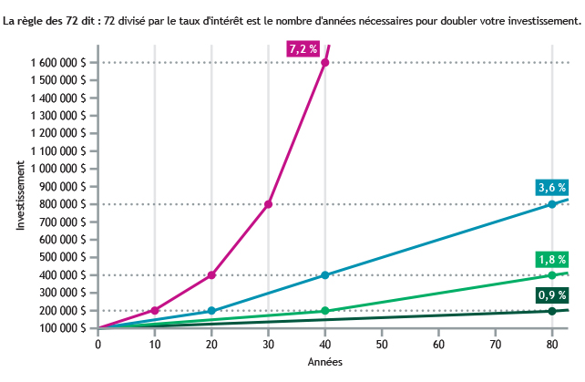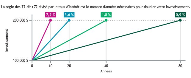 La règle de 72 est une simple approximation du temps nécessaire pour doubler la valeur d’un placement. La règle stipule que vous pouvez estimer le nombre d’années nécessaires en divisant 72 par le taux d’intérêt annuel. Par exemple, si vous avez un investissement à un taux fixe de 7,2 %, il vous faudra environ 10 ans pour doubler votre investissement, car 72 divisé par 7,2 est égal à 10, alors qu’à 3,6 % (la moitié de 7,2 %), il vous faudra 2 fois plus de temps, car 72 divisé par 3,6 est égal à 20, et ainsi de suite.